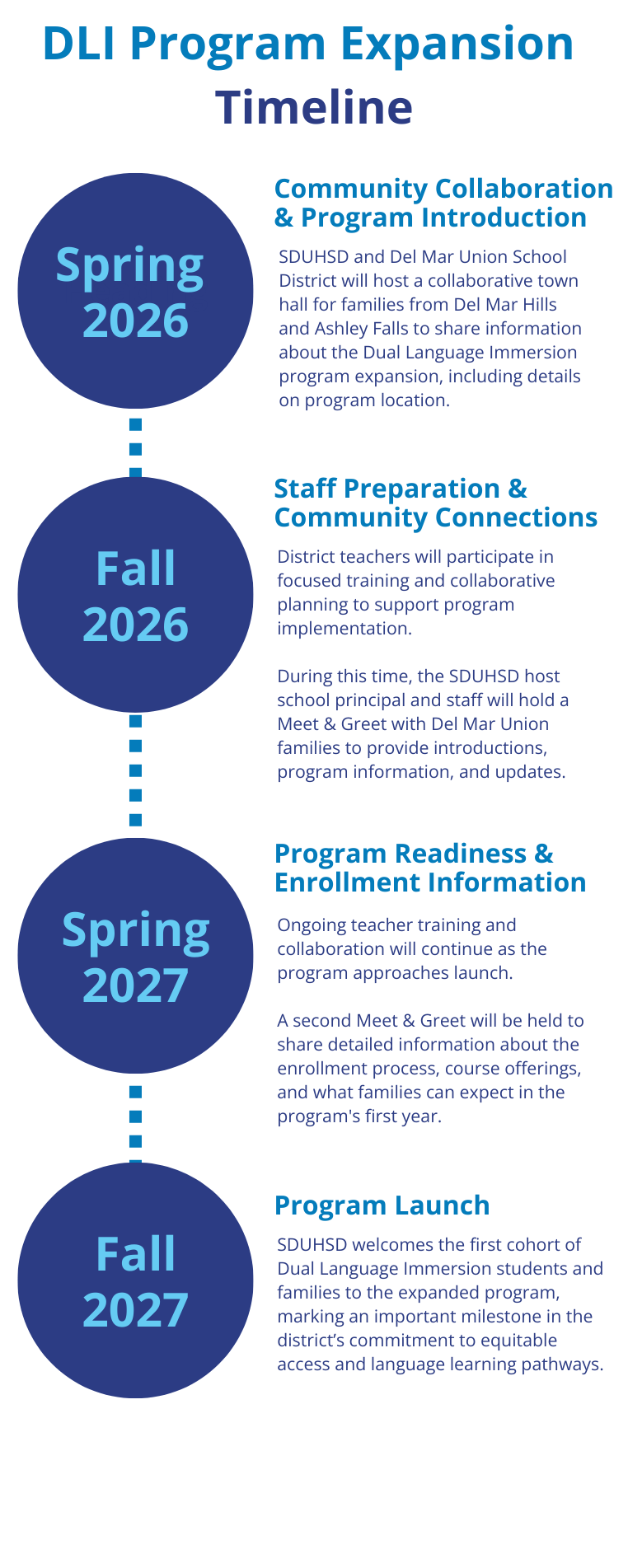 Beginning in the 2027-28 school year, SDUHSD will expand access to its Dual Language Immersion (DLI) programs to better serve students and families across the district. This expansion includes adding a DLI program at Carmel Valley Middle School, complementing the District’s existing program at Diegueño Middle School.